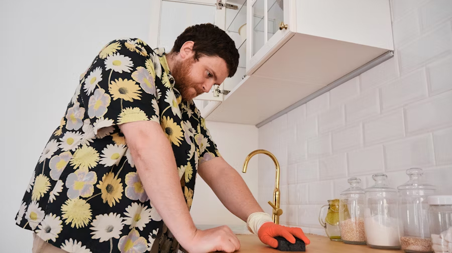 Wiping down the kitchen counter